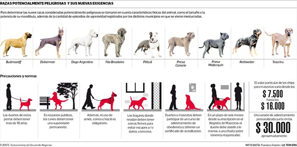 Entre estas razas destacan algunas bastante comunes en nuestro país: Rottweiler, Doberman, Pitbull, Dogo Argentino y otras cinco menos conocidas: Bullmastiff, Fila Brasileiro, Presa Canario, Presa Mallorquín y Tosa Inu.
