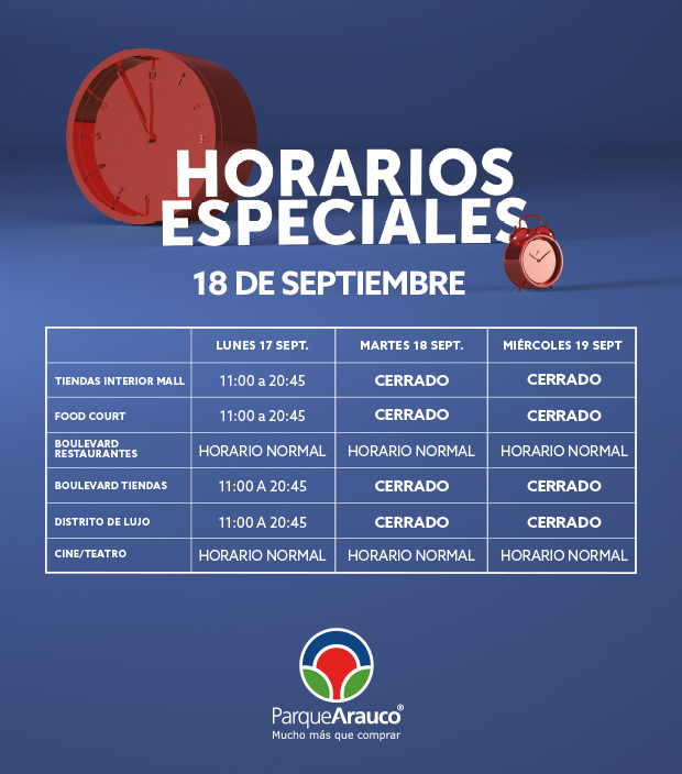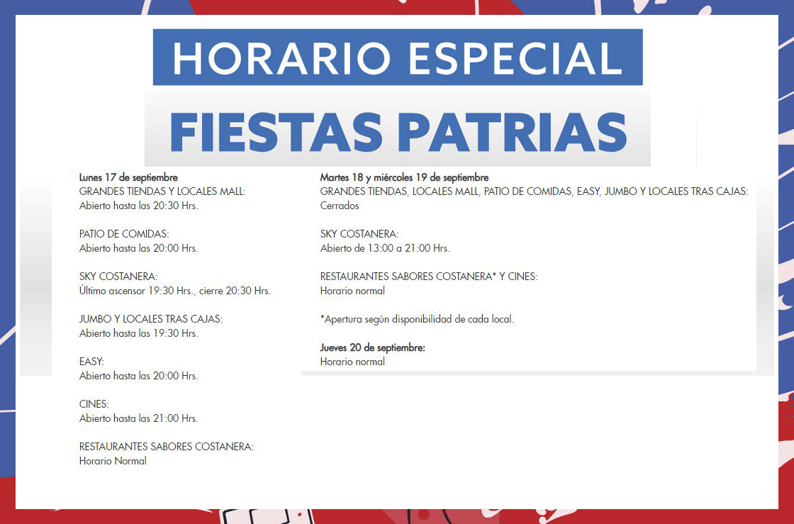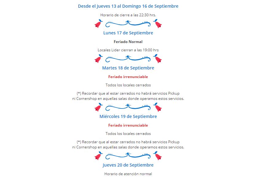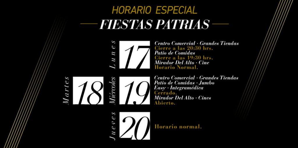 Por otra parte el martes 18 y miércoles 19, por disposición del Código del Trabajo, son feriados irrenunciables y por ello, todas las tiendas del sector «comercio» estarán cerradas.