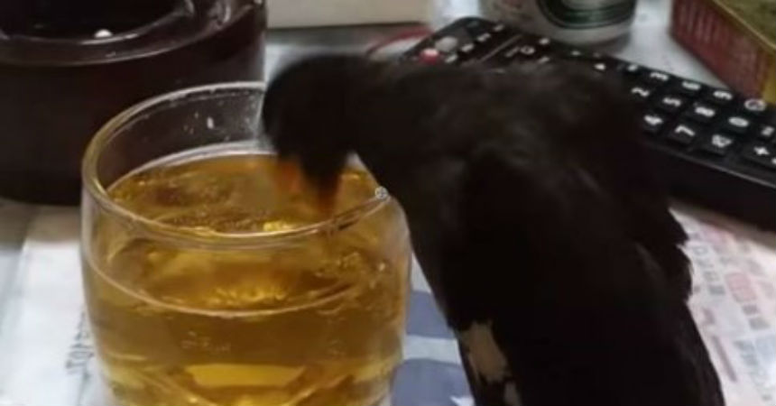 El sujeto emborrachó al animal, dándole de beber en un vaso: «Este pajarito se cayó de su nido y lo adopté. Realmente está tomando cerveza», dijo a ViralHog.