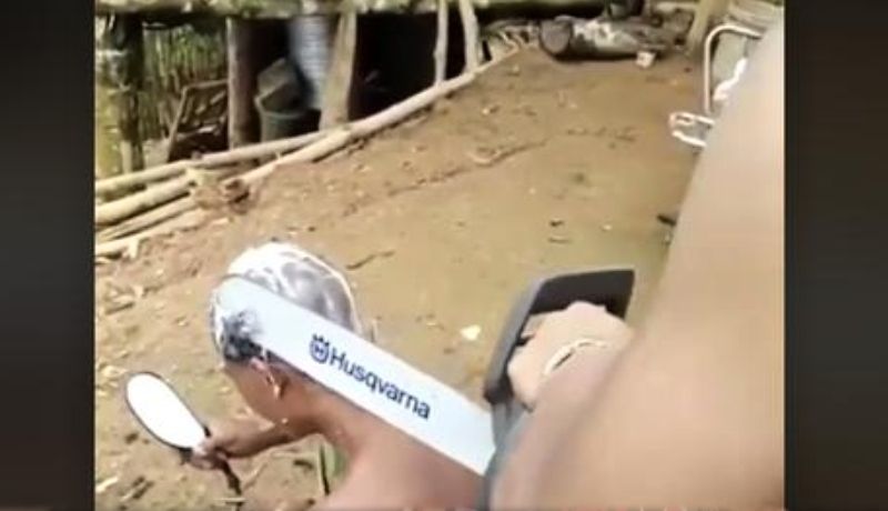En las imágenes podemos ver a uno de los hombres sentado en el suelo con la cabeza llena de jabón. De repente, su compañero, que está de pie junto a él, aparece con una motosierra en la mano y la acerca a la cabeza de su amigo y comienza a cortarle el cabello.