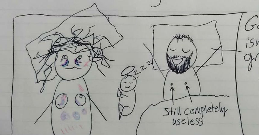 Por ello, Mattea no encontró nada mejor que dibujárselo para que comprendiera la difícil situación que ella estaba viviendo. Fue así como hizo una serie de dibujos en la que aparece con los pezones adoloridos y el pelo todo desarreglado, mientras Kriss duerme sin preocuparse de nada.