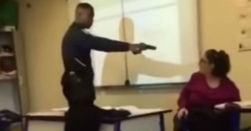 En las imágenes, grabadas por otro estudiante, se ve como el alumno, de 16 años, apunta con un arma a la docente mientras le exige que lo borre de la lista de ausentes de la clase, pese a que había llegado tarde.