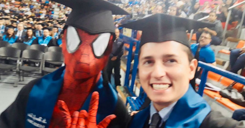 Hiram Salas Romero de 22 años decidió disfrazarse de Spiderman en la ceremonia de graduación. Ocultó el llamativo traje bajo la clásica túnica negra que se ocupa para esas ocasiones y a la hora de recibir el diploma, entró vestido como el superhéroe estadounidense.
