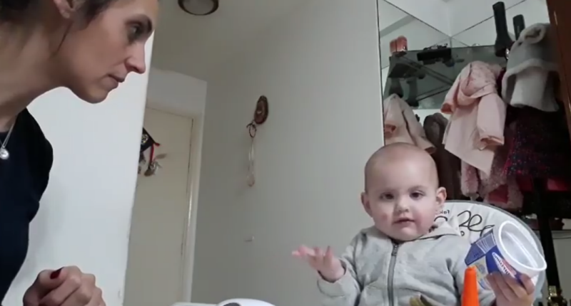 «Tenemos que hablar, ¿por qué no comes la papa?», le dice a la niña haciendo gestos con las manos, sin embargo, ella repite lo que hace su madre y balbucea algunas palabras, generándose una divertida «discusión».