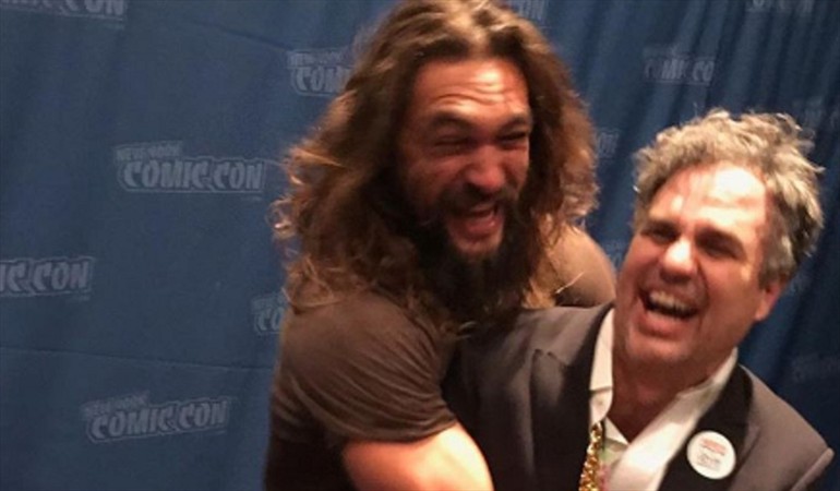 Cuando «Hulk» se sacó la máscara y reveló su identidad, ambos comenzaron a reírse y abrazarse por la gran sorpresa, que fue grabada y compartida por Momoa en Instagram.