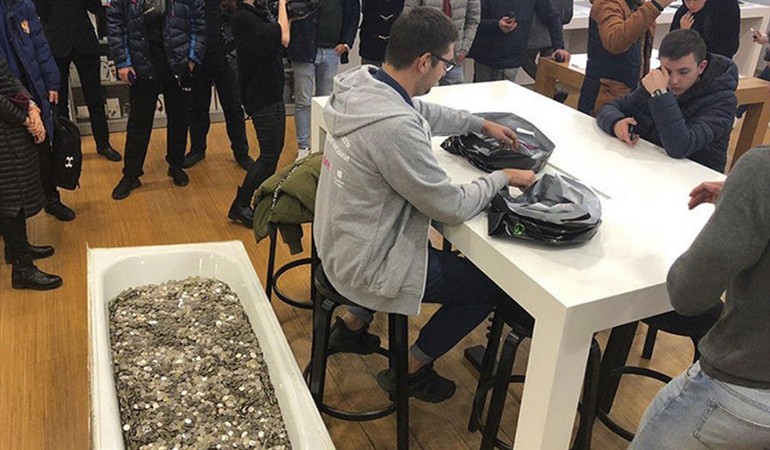 Ese fue el caso de un joven ruso quien llegó con una tina con alrededor de 100 mil rublos en monedas–cerca de unos 1.018.112 en peso chileno- a una tienda Apple para comprarse el iPhone XS con 256 GB de memoria interna. Así es, el caro no dudó en llevar la pesada bañera al establecimiento ubicado en Moscú.