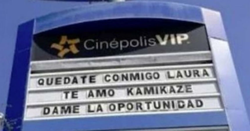 «Quédate conmigo Laura. Te amo Kamikaze. Dame la oportunidad de volver a tu lado y de ser eterno en cada beso», escribió el chico en el cartel donde se anuncian las películas de la sala Cinépolis VIP. Durante 40 minutos se exhibió dicho mensaje gracias a un permiso especial que el joven solicitó.