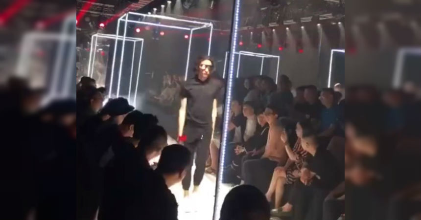 Tras atravesar varios arcos de luz en la pasarela, el joven gira para continuar su camino. De repente, cuando va a cruzar un nuevo arco, tropieza con el marco de este. Es entonces cuando, de forma muy dramática, comienza a hacer movimientos que recuerdan a pasos de baile e intenta hacer creer a los presentes que se trata de algo totalmente planeado, aunque la verdad es que solo evitaba caer y ser la burla del lugar.