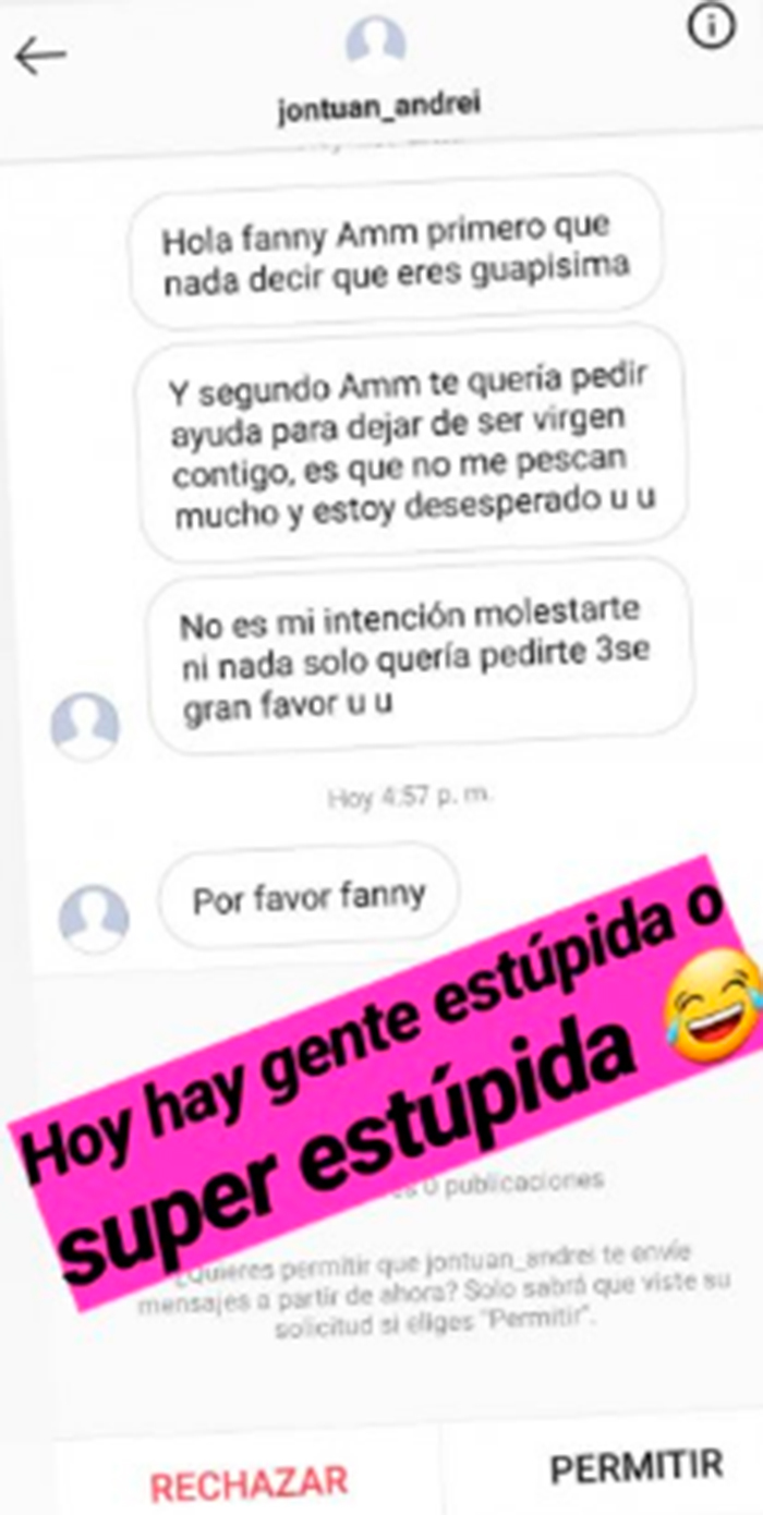 La chiquilla quiso funarlo a través de su cuenta de Instagram ya que él le dejó un comentario nada que ve en sus historias: “Hola Fanny, primero que nada decir que eres guapísima. Te quería pedir ayuda para dejar de ser virgen contigo, es que no me pescan mucho y estoy desesperado”, fue parte del escrito que recibió en la red social.