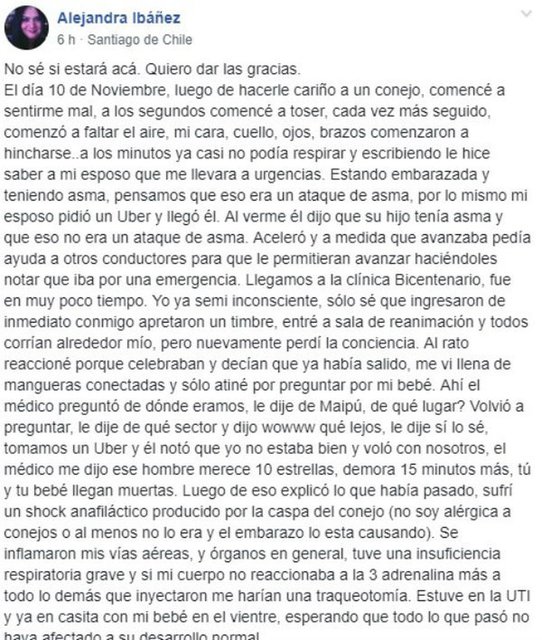 Alejandra Ibáñez es una chilena usuaria de Uber que hizo pública una dramática experiencia que casi le cuesta la vida y la de su bebé que está por nacer. Gracias a la rápida reacción de un conductor de la popular aplicación pudo llegar a tiempo al hospital donde los médicos la lograron estabilizar. «Demora 15 minutos más, tú y tu bebé llegan muertas», le dijo un especialista.