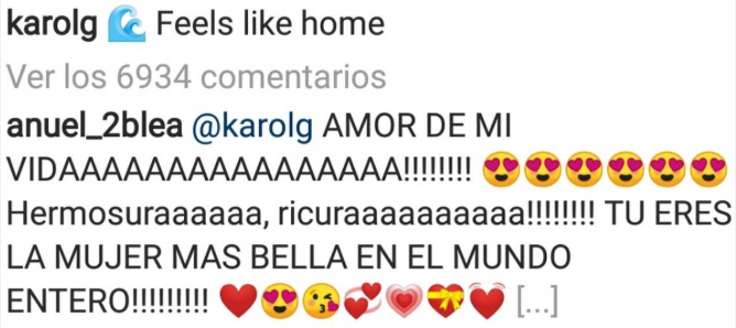 «Amor de mi vida, Hermosuraaaaaa, ricuraaaa. TÚ ERES LA MUJER MÁS BELLA EN EL MUNDO ENTERO», fue el mensaje que escribió Anuel AA a Karol G en su fotografía.