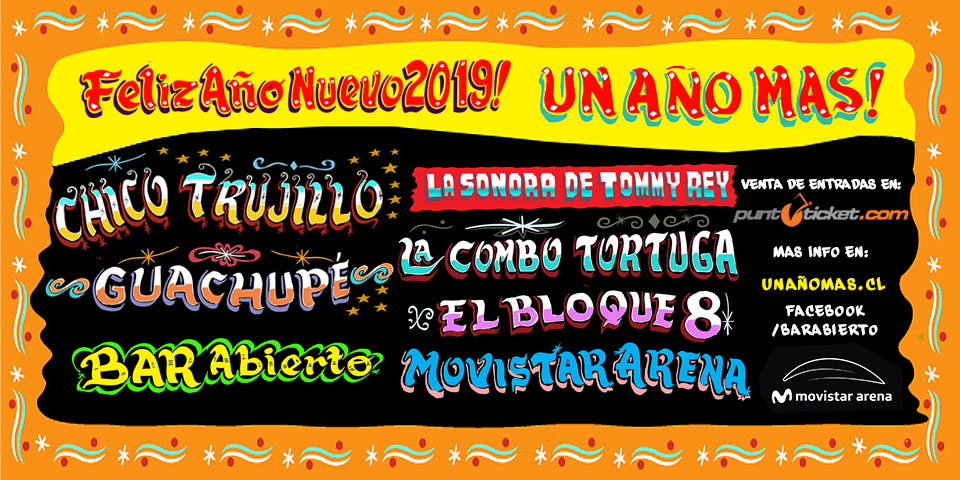 «Chico Trujillo», «La Sonora de Tommy Rey», «Guachupé», «La Combo Tortuga» y «El Bloque 8», son los artistas que animarán la fiesta «Un Año Más» que se realizará en Movistar Arena desde las 00:30 hrs hasta las 7 de la mañana. Las primeras mil entradas son a 15 mil pesos, luego la segunda preventa a $20.000 lucas y el día del evento la entrada general tiene un costo de 25 mil pesos.