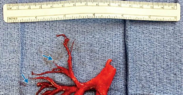 Tras expulsar el coágulo, que medía 15 entímetros de ancho, los médicos intubaron rápidamente la tráquea del paciente. El tubo permaneció durante dos días después y no volvió a tener más episodios de expectoración tan espectaculares como el de la foto.
