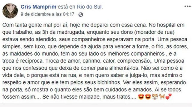 «Con tanta gente mala por ahí, hoy me encontré con esa escena. En el hospital en el que trabajo, a las 3 de la madrugada, mientras su dueño (habitante de la calle) estaba siendo atendido, sus compañeros esperaban en la puerta. Una persona simple, sin lujos, que depende de la ayuda para vencer el hambre, el frío, los dolores, las maldades del mundo, tiene a su lado los mejores compañeros, y el intercambio es recíproco. Intercambio de amor, cariño, calor, comprensión… una persona que nos confesó que deja de comer para alimentarlos. No sé cómo es su vida, porque está en la calle, y no me importa ni lo juzgo, pero admiro el respeto y el amor que tiene por sus mascotas. Verlos así, esperando en la puerta, sólo muestra lo mucho que son bien cuidados y amados. Ay, si todos fueran así…. si no tuvieran maldad, malos tratos….», escribió Cris Mamprim junto a la foto.