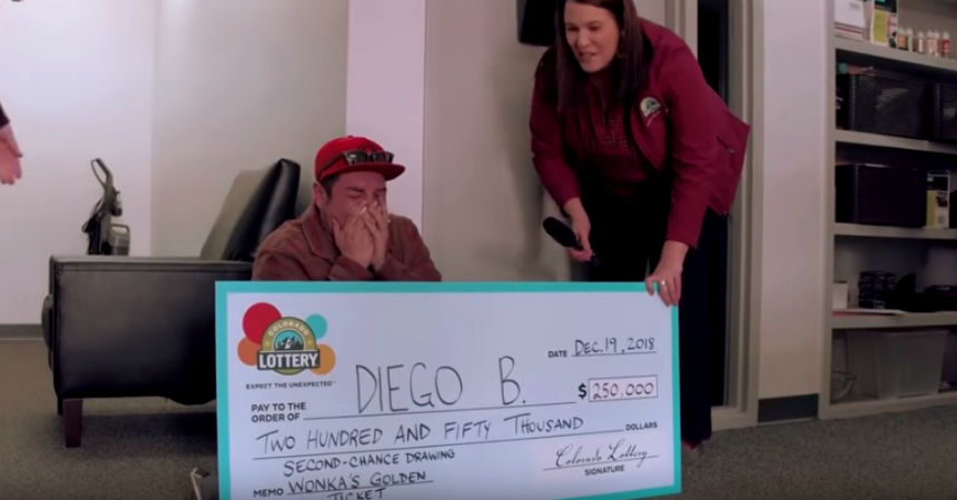 Diego ganó uno de los premios de Scratch Wonka’s Golden Ticket y fue tal su impresión cuando supo la suma que le iban a entregar que cayó de rodillas al suelo sin poder contener las lágrimas de la emoción.