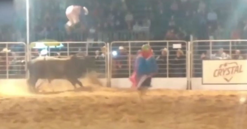 Pues bien, en un rodeo brasileño fue un toro quien «cobró venganza» por todos los malos tratos sufridos en la arena, cuando de una cornada lanzó por los aires a un sujeto que intentó controlarlo.