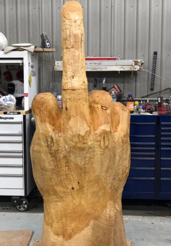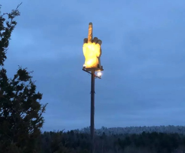 Al enterarse, Ted Pelkey planeó una original venganza, ya que realizó una figura de una enorme mano de madera con el dedo medio extendido que se puede ver desde toda la ciudad.