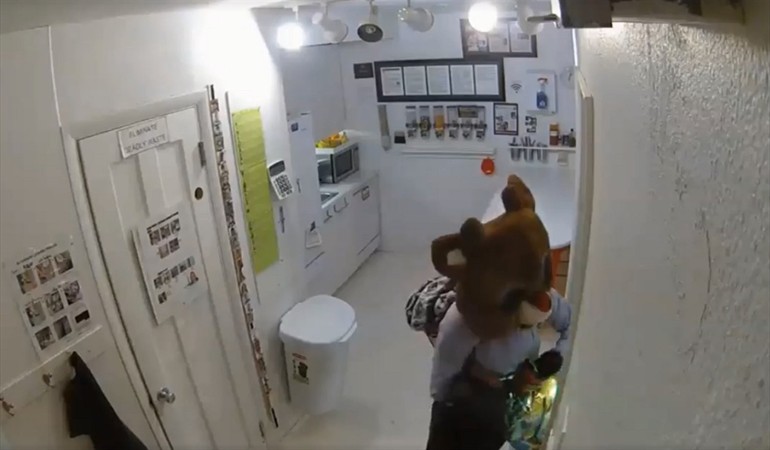 El registro muestra al ladrón utilizando un disfraz de Rodolfo, el reno, para cometer el delito, pero de un momento a otro se quita la máscara y muestra su cara a la cámara, revelando que es una mujer.