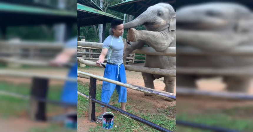 Se trata de Khunsuk, de un año y que vive en el campamento de elefantes Maesa en Chiang Mai, Tailandia. En el video se ve que le exige a Dan Daeng, quien en ese momento estaba pintando una cerca, que jueguen juntos.