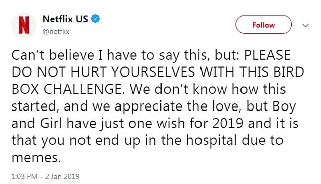 Luego del éxito de Bird Box, las personas comenzaron con el reto #BirdBoxChallenge, el cual consiste en hacer cosas con una venda, es por eso que Netflix tuvo que pedir a través de redes sociales que no lo hagan porque puede ser peligroso.