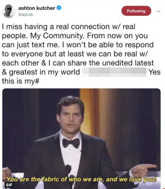 ¿Por qué Ashton Kutcher compartió su número de teléfono en redes?