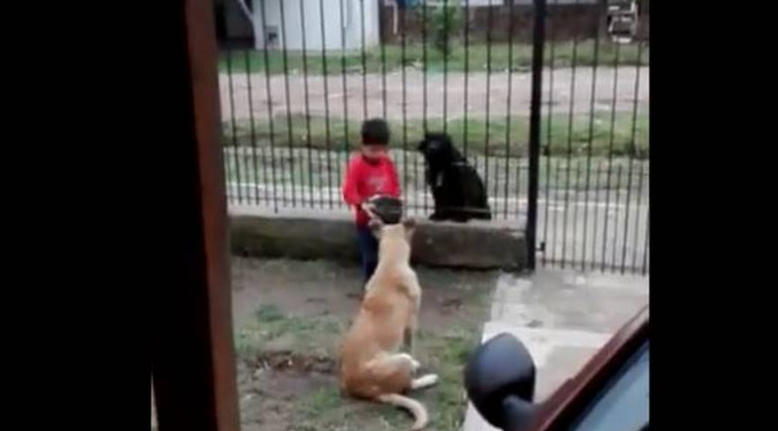 El menor toma el plato con ambas manos, y permite que ambos animales coman mientras les señala sus respectivos turnos. «Para vos, para vos», se escucha decir.