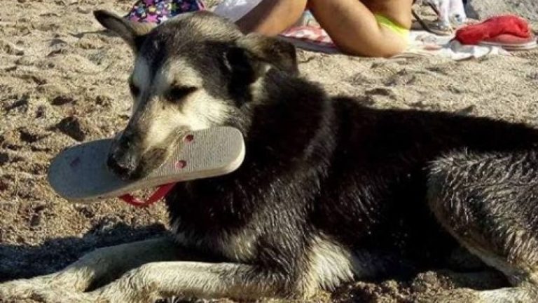 El can callejero bautizado como «roba ojotas» ya es toda una celebridad en la playa de Santa Clara del Mar en Argentina por su «especial» forma de abordar los turistas que llegan al balneario.