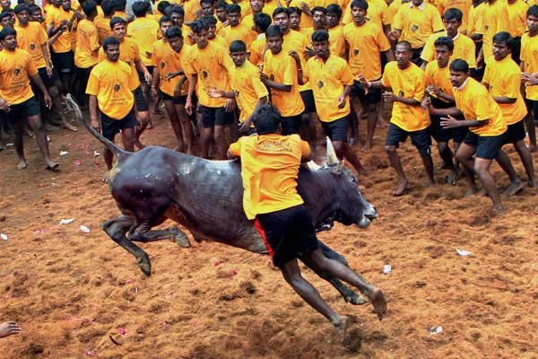 El festival de Jallikattu es toda una tradición en India y consiste en liberar un toro de un corral con el fin de embestir a los participantes y que estos a su vez traten de «dominarlo» y agarrarle la joroba.