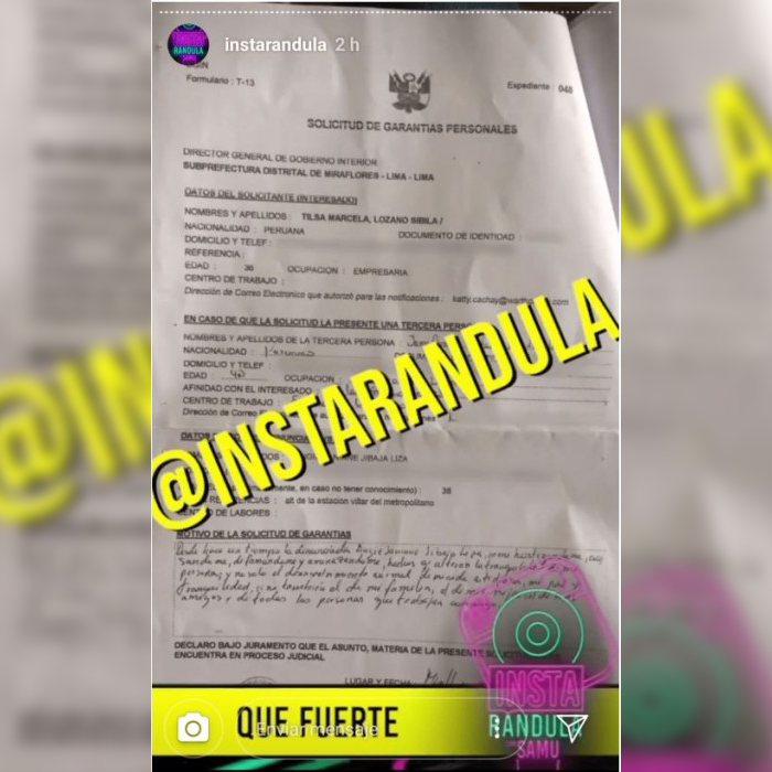 A través de Instagram, compartieron un documento dirigido a la Subprefectura Distrital de Miraflores en Lima, donde hacían referencia a una denuncia a Angie Jibaja por hostigamiento y amenazas, entre otros motivos.