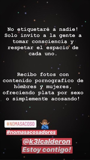 «No etiquetaré a nadie. Solo invito a la gente a tomar conciencia y respetar el espacio de cada uno. Recibo fotos con contenido pornográfico de hombres y mujeres, ofreciendo plata por sexo ¡o simplemente acosando!», escribió «el joven en Instagram Stories.