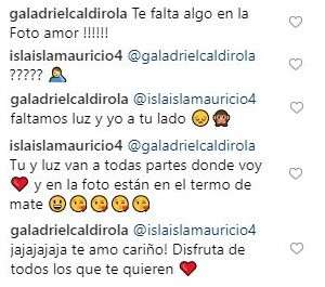 Por su parte, el Mauricio le respondió a la modelo que: «tú y Luz van a todas partes donde voy, y en la foto están en el termo de mate», ya que en él tiene fotos de sus «amores».
