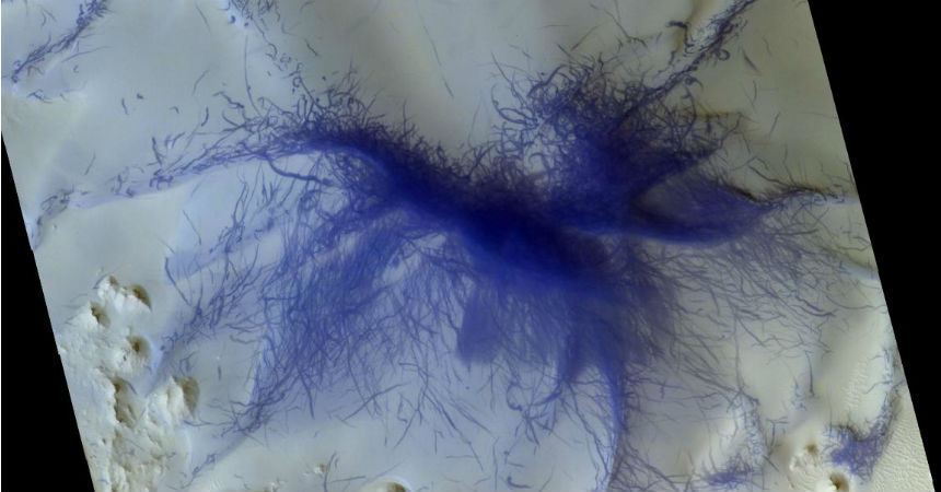 Pero en realidad, la llamada araña es un patrón dejado por cientos o quizá miles de remolinos de polvo. Y no, el rastro de los tornados en Marte no es azul. Esta enorme huella era de color rojo oscuro, pero el CaSSIS decidió darle un contraste en azul que permitiera reconocer mejor el camino que siguieron estos fenómenos de la naturaleza marciana.