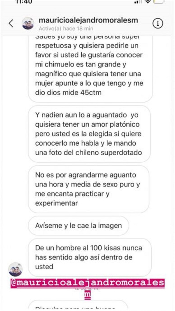 En sus stories la chiquilla compartió pantallazos de los mensajes que Mauricio Morales le ha estado mandado durante las últimas semanas, preguntándole si «quiere conocer a mi chimuelo».
