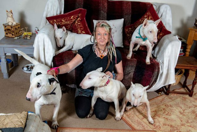 Liz mantiene una granja en Reino Unido, donde cuida de sus decenas de perros de raza bull terrier, muchos de los cuales ha rescatado de la calle.