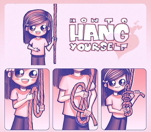 En la ilustración, donde destacan los colores pasteles, un personaje enseña a hacer un nudo con una soga, en una serie de nueve viñetas, donde luego se quita la vida con un rostro sonriente.