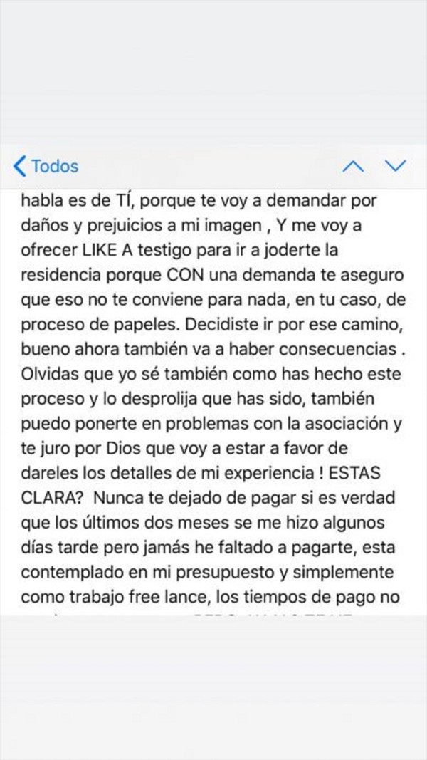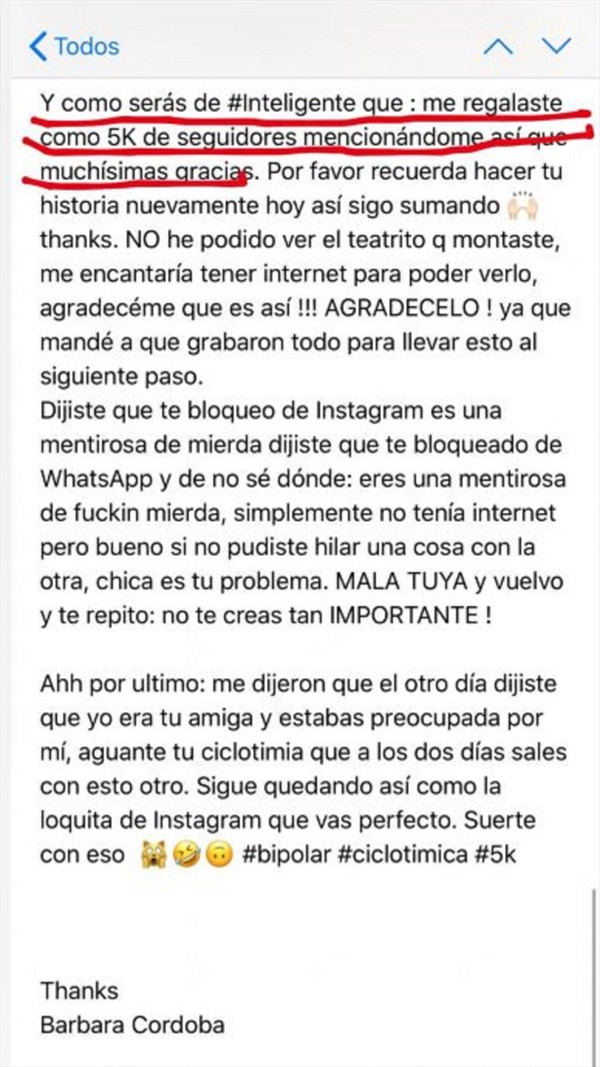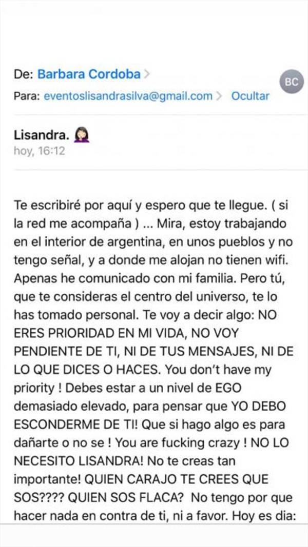 Estas palabras no le gustaron para nada a la «desaparecida» así que decidió enviarle un extenso email a la polola de uno de los Power Peralde Raúl, amenazándola por tratarla de ladrona y de creerse el centro del mundo.