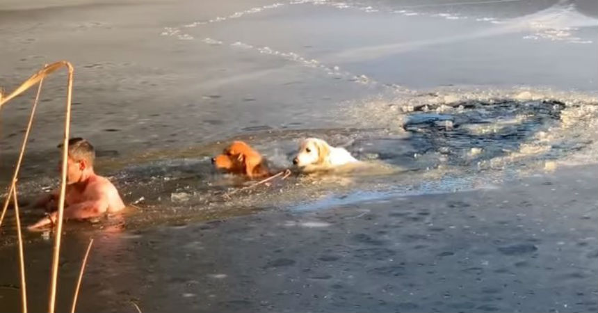El valiente hombre no dudó en lanzarse al agua fría para salvar a los dos canes en peligro.