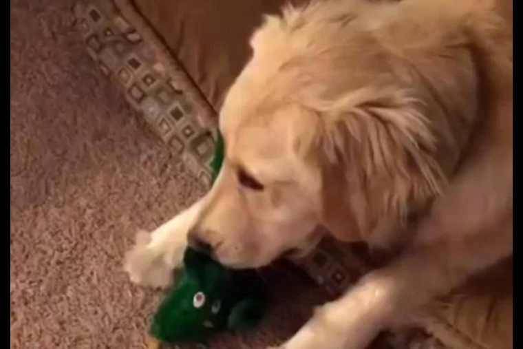 En el clip se puede ver a la golden retriever jugando tranquilamente con Gumby cuando hasta que aparece su amigo disfrazado del mismo.
