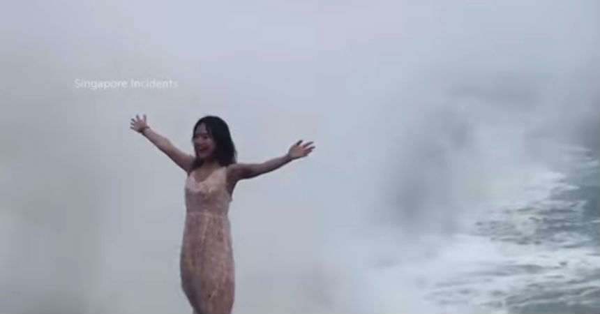 Como se puede ver en el video, la mujer se paró en el acantilado para conseguir una foto con una gran ola a sus espaldas.