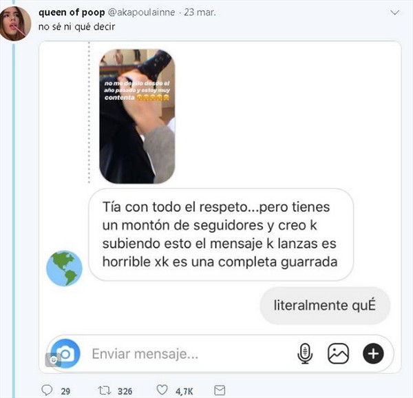 «He recibido muchísimos comentarios de amor y apoyo pero también muchísimos de rechazo y odio por un vídeo súper inocente que subí ayer sin ninguna intención ‘feminista’ ni reivindicativa, lo cual me conduce a pensar que todavía existe un problema y que no estamos tan avanzados como sociedad ni tan liberadas como mujeres como creemos», opinó.