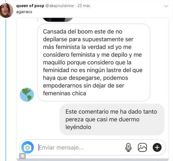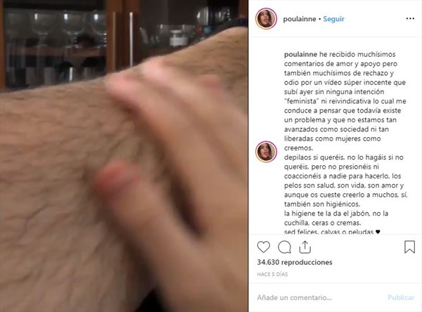 Agregando que «depílate si quieres, no lo hagas si no quieres, pero no presiones ni coacciones a nadie para hacerlo, los pelos son salud, son vida, son amor y aunque les cueste creerlo a muchos, sí, también son higiénicos. La higiene te la da el jabón, no la cuchilla, ceras o cremas. Sean felices, calvas o peludas».