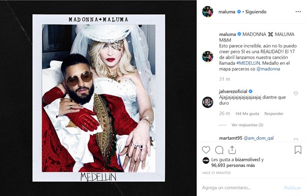 Madonna y Maluma han sorprendido a sus seguidores al anunciar una próxima colaboración. Se trata de Medellín canción que será parte del nuevo disco de la Reina del Pop llamado Madame X, y que el próximo 17 de abril será lanzado en todas las plataformas digitales.