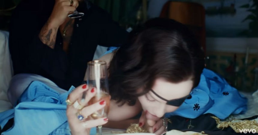 La Reina del Pop, que aparece con un parche en el ojo, disfruta tumbada en una cama junto a Maluma, con quien bebe champán y juega a la seducción y provocación. Pero el gran momento estelar de «Medellín» llega cuando la cantante se incorpora hacia la cámara y comienza a chupar un dedo del pie a su compañero.