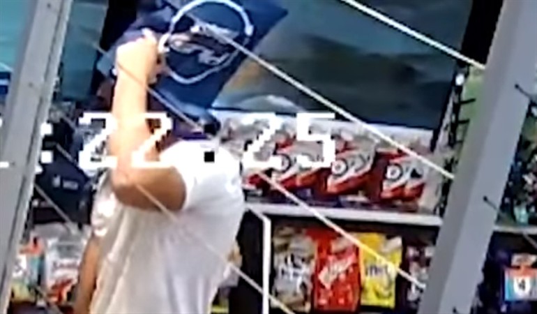 En la grabación de la cámara de seguridad del local, se ve como el amigo de lo ajeno no tiene dónde dejar lo sustraído, por lo que se quitó la bolsa de su cabeza, revelando su rostro antes de irse, sin dejar heridos eso sí.