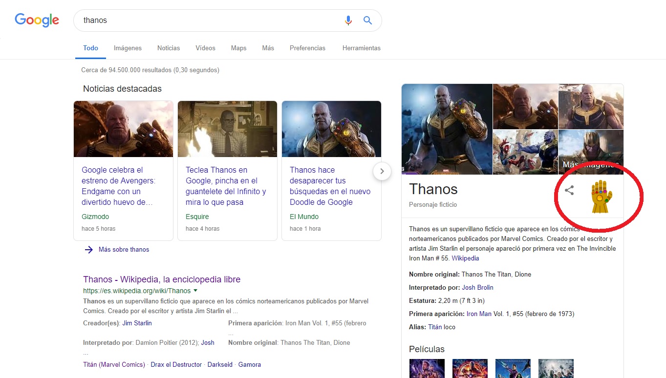Sólo debes buscar Thanos en Google en escritorio o en tu celular, lo que te entregará cerca de 94.500.000 resultados encontrados.