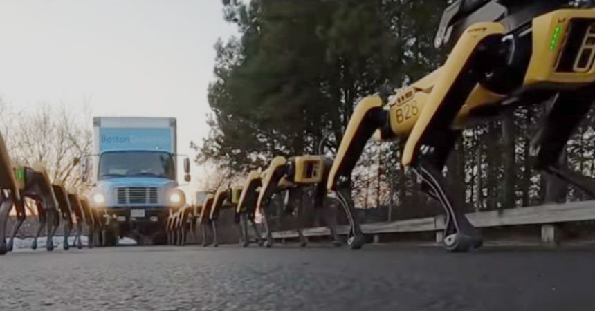 Para demostrar que los robots, además de sutileza son dueños de una gran fuerza, se publicó un video en el que aparece una tripa de estos «perros robots» remolcando nada menos que un camión.