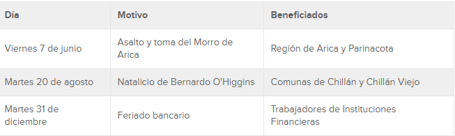 Eso sí hay que destacar que adicionalmente , hay feriados que sólo aplican dentro de una región o para un grupo de personas, los cuales son los siguientes: