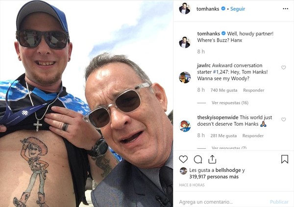 El actor Tom Hanks quien interpreta a la voz del vaquero se sacó una selfie con este fanático y claro quiso compartirla con sus seguidores: «Bueno, ¡qué gran compañero! ¿Dónde está Buzz?», escribió el artista junto a la imagen.