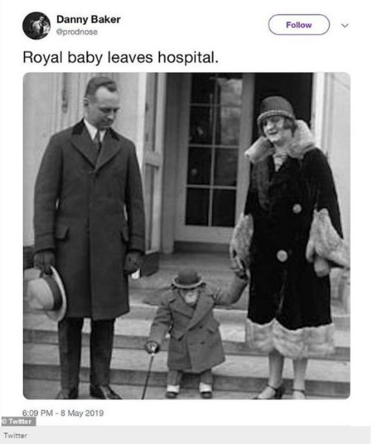 «El bebé real abandona el hospital», tuiteó Baker, junto a una imagen en blanco y negro de una pareja elegantemente vestida, cuya mujer le da la mano a un chimpancé con un traje y un sombrero.