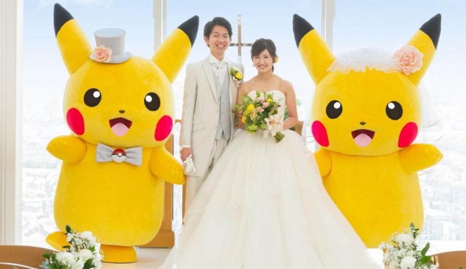 «Escrit», empresa japonesa, se unió a «The Pokemón Company», para armar un matrimonio como todo fan de Pokemón quiere que sea: Con dos Pikachu al lado. Uno vestido de novia y el otro de novio.